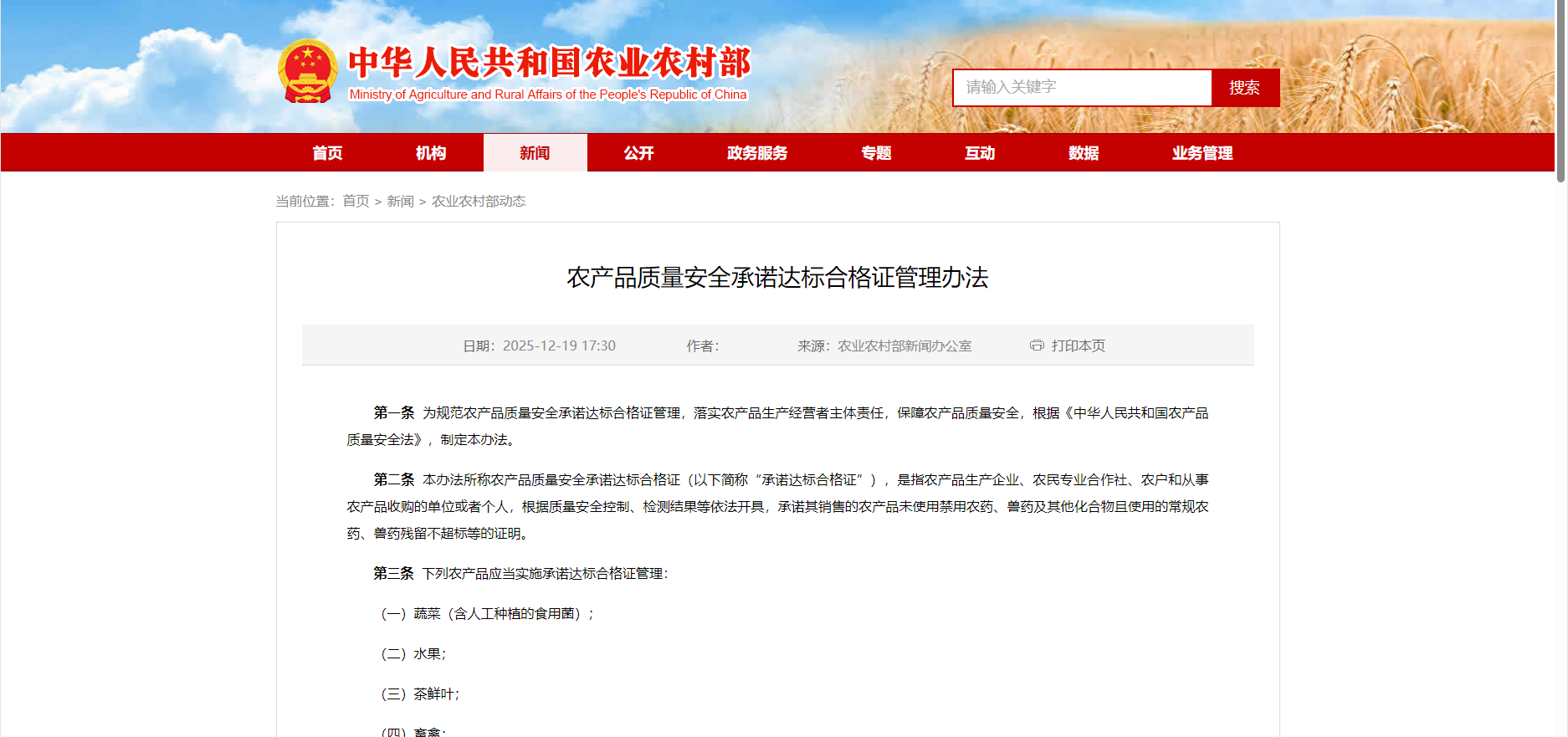自2026年2月1日起《农产品质量安全合格证管理办法》将正式施行,这是一次农业与畜牧业底层逻辑的重构,从“抽检为主”走向“全程承诺”,从“事后追责”走向“源头负责”,中国农产品质量安全,正式迈入规范化、标准化、责任化的新阶...